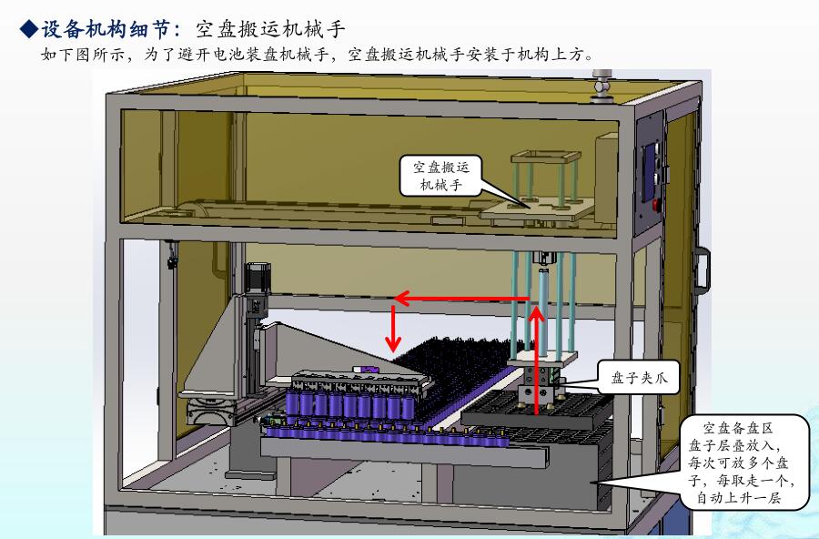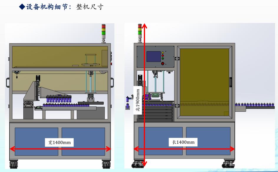 主要技术参数说明 1、设备效率:110~120个电池/min; 整线稼动率:大于90%; 2、设备尺寸: L × W × H=1400 × 1400 × 1900(mm) (不包括伸出的输送带长度) 3、电源电压:AC220V 50Hz 4、工作气压:0.5-0.7MP 5、设备用PLC控制,触摸屏操作,设有启动、故障急停、 复位等开关。 6、机构设计模块化,使设备操作简单,维护方便。