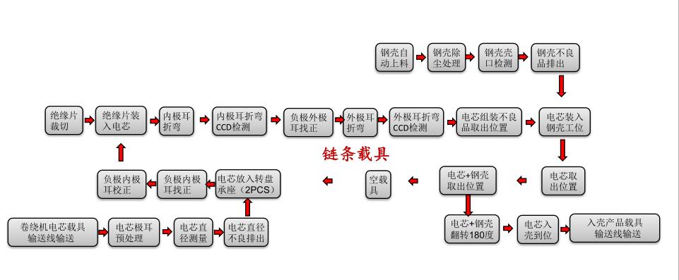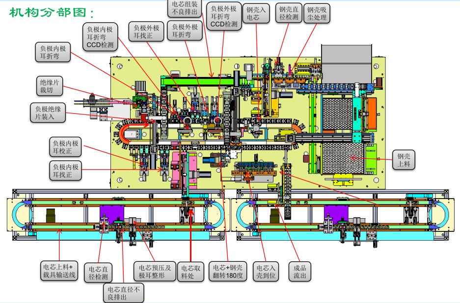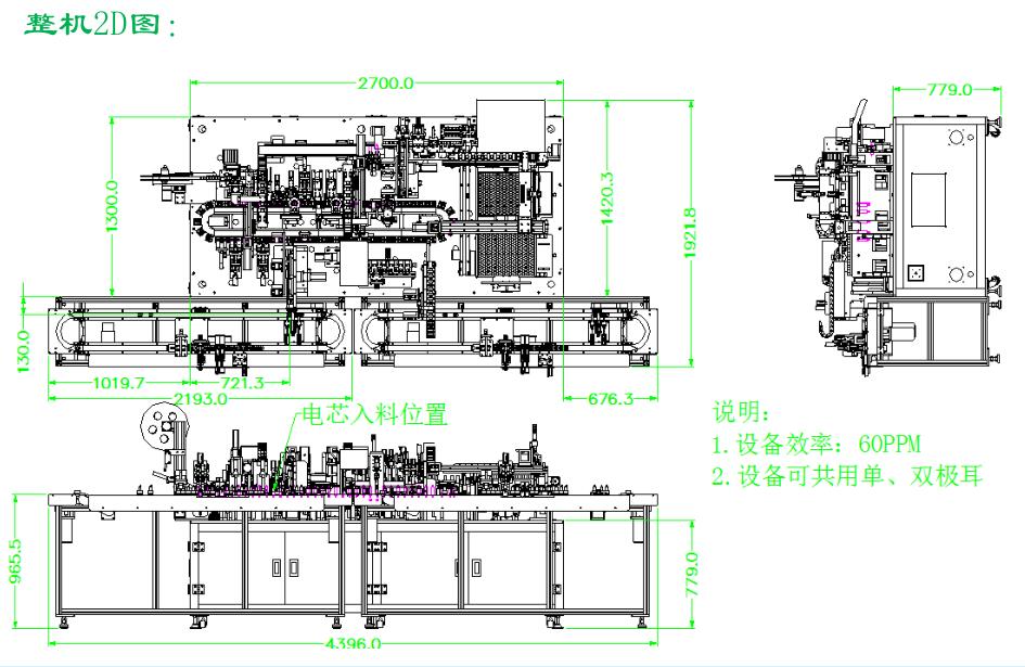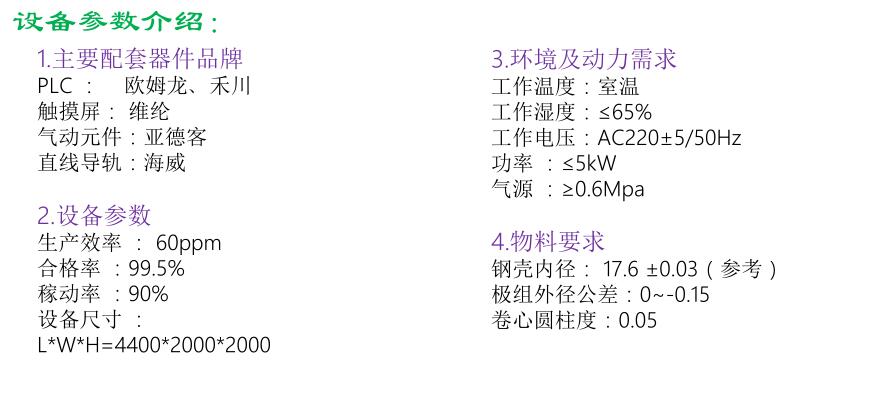 1. 产品特性: 18650电芯负极单、双极耳可共用 2. 设备技术性能指标 产能:≥60ppm 合格率:≥99.5% 稼动率:≥90% 设备尺寸:长4.4米*宽2米*高2米
